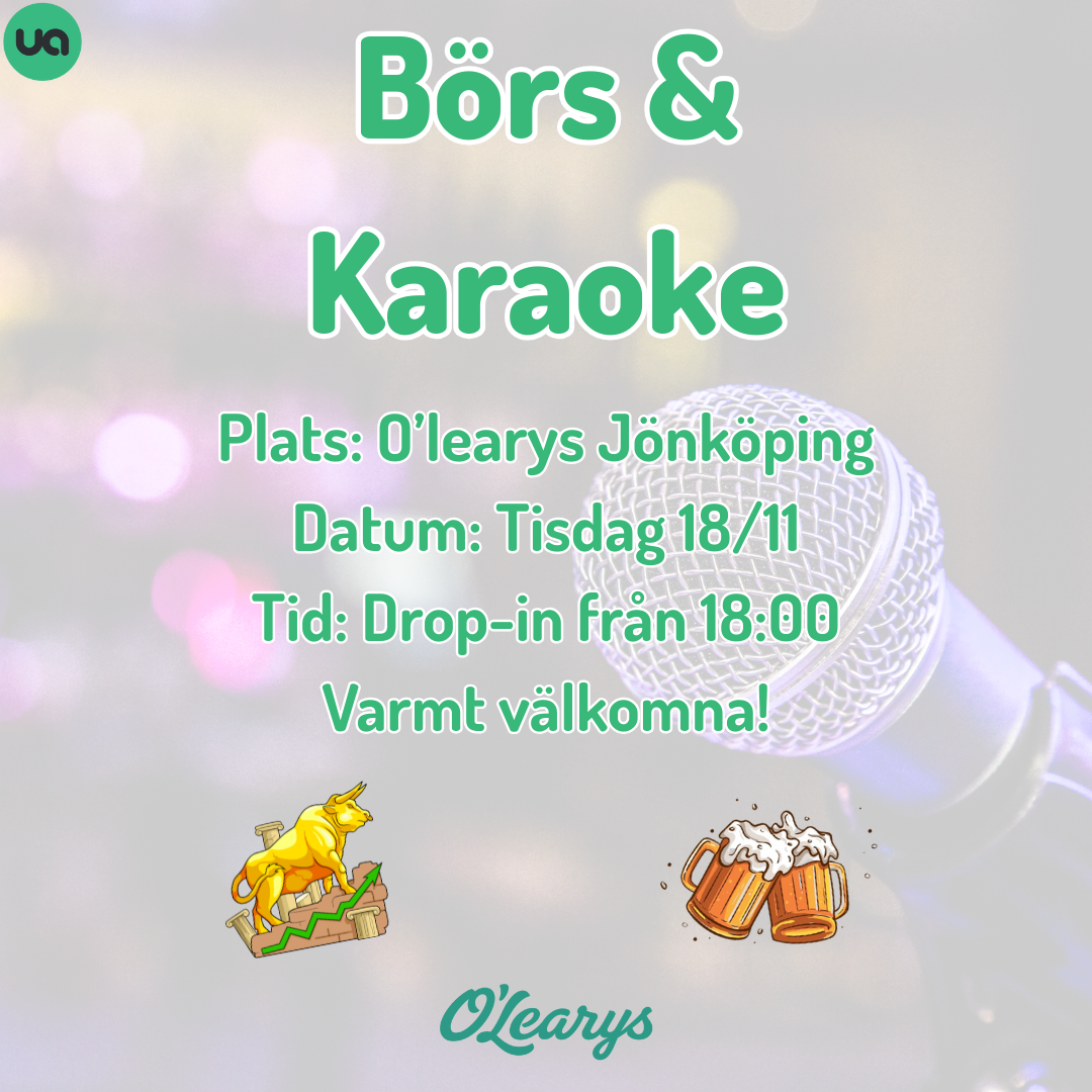 Vi kommer att ses på O’learys på tisdagen 18/11, drop-in från klockan 18:00. Eventet kommer att fokusera på snack om aktier, sparande och investeringar men också på att ha en avslappnad och trevlig kväll ihop kombinerat med karaokesång. Om detta låter intressant – kom gärna och ta med en vän.