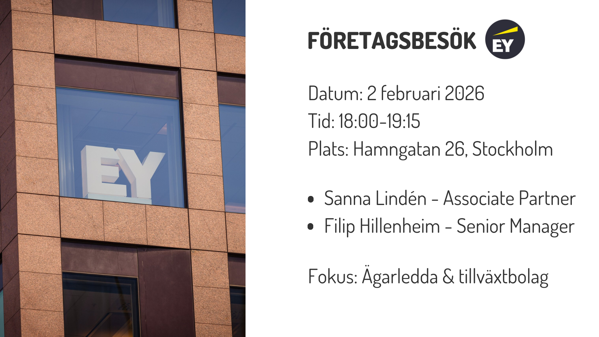 Vi kommer att få träffa två auktoriserade revisorer inom gruppen för ägarledda & tillväxtbolag på EY:s kontor i Stockholm i deras välkända client lounge på våning 11.