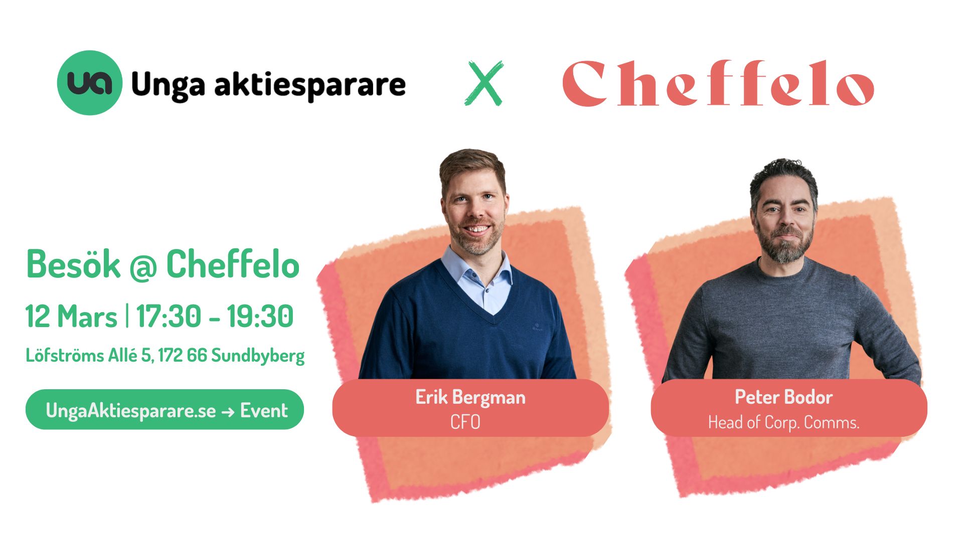 Unga Aktiesparare Solna/Sundbyberg bjuder in till företagspresentation på Cheffelos huvudkontor i Sundbyberg. Cheffelos CFO Erik Bergman och Head of Corporate Communications Peter Bodor kommer under kvällen att ge en inspirerande presentation där de lyfter fram Cheffelo som ett spännande investeringscase. Du får en unik chans att lära känna bolaget på djupet, från affärsidé och verksamhetsmodell till deras visioner och framtidsutsikter. Presentationen riktar sig till unga investerare, och du har möjlighet att ställa dina egna frågor direkt till ledningen. Dessutom får vi ta del av insikter om hur vardagen ser ut bakom kulisserna på ett snabbväxande foodtech-bolag.