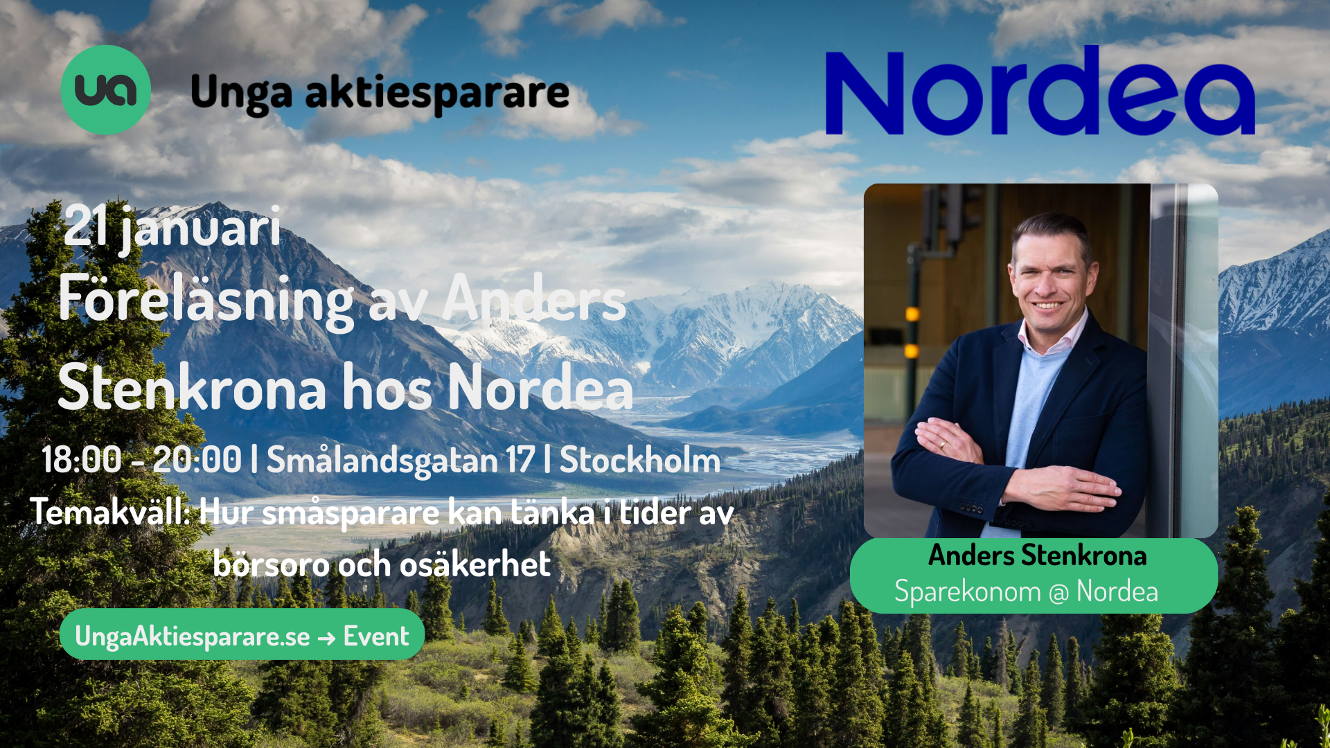 Under kvällen får vi träffa Anders Stenkrona, Nordeas privatekonom. Anders kommer att dela med sig av sina perspektiv på marknadsläget, investeringar och hur vi småsparare kan resonera i tider av börsoro och osäkerhet på finansmarknaderna.
