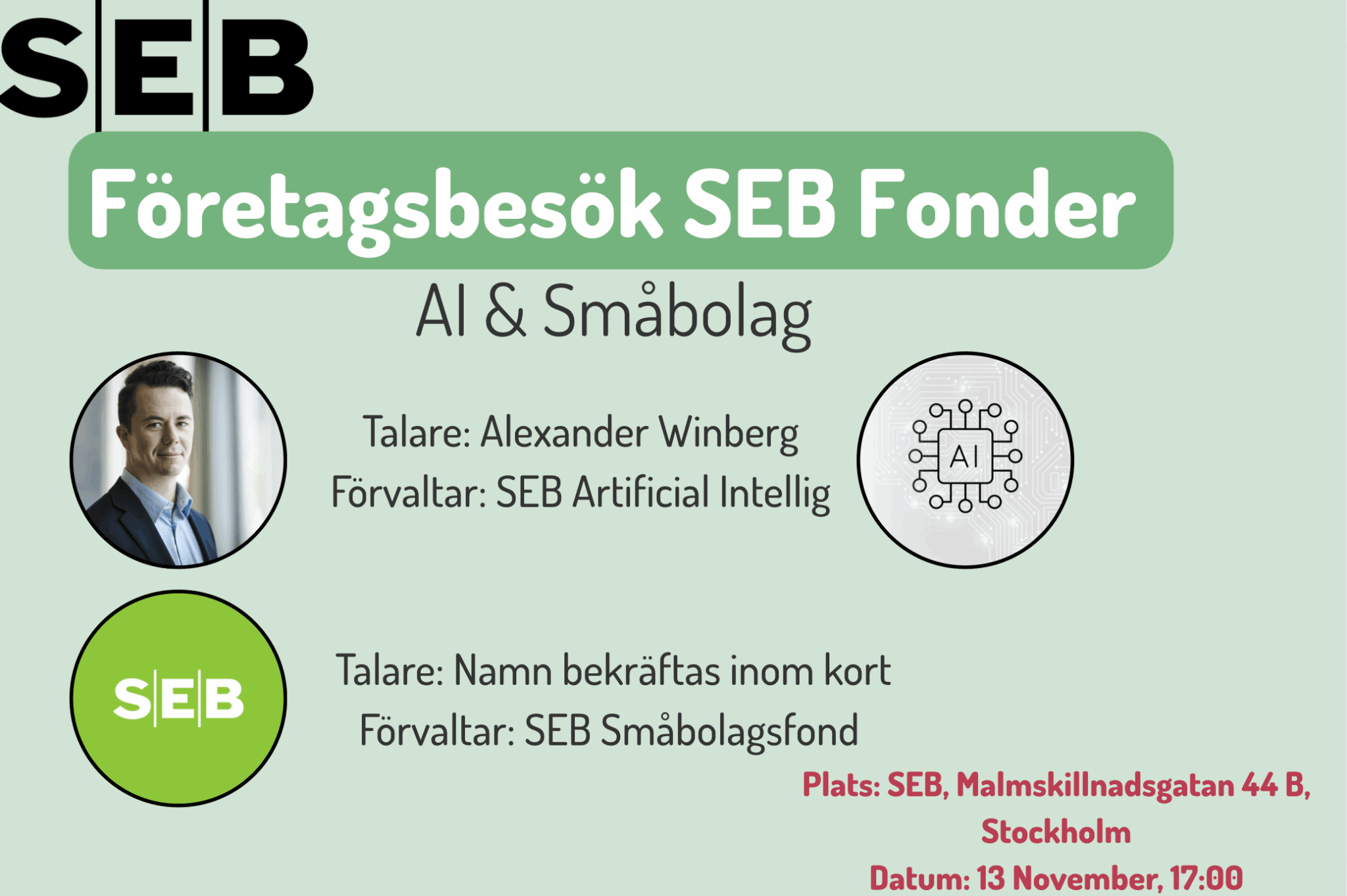 Under kvällen får vi även träffa en av SEBs småbolagsförvaltare (namn bekräftas inom kort), som presenterar hur de arbetar med att hitta morgondagens vinnare på småbolagsmarknaden.