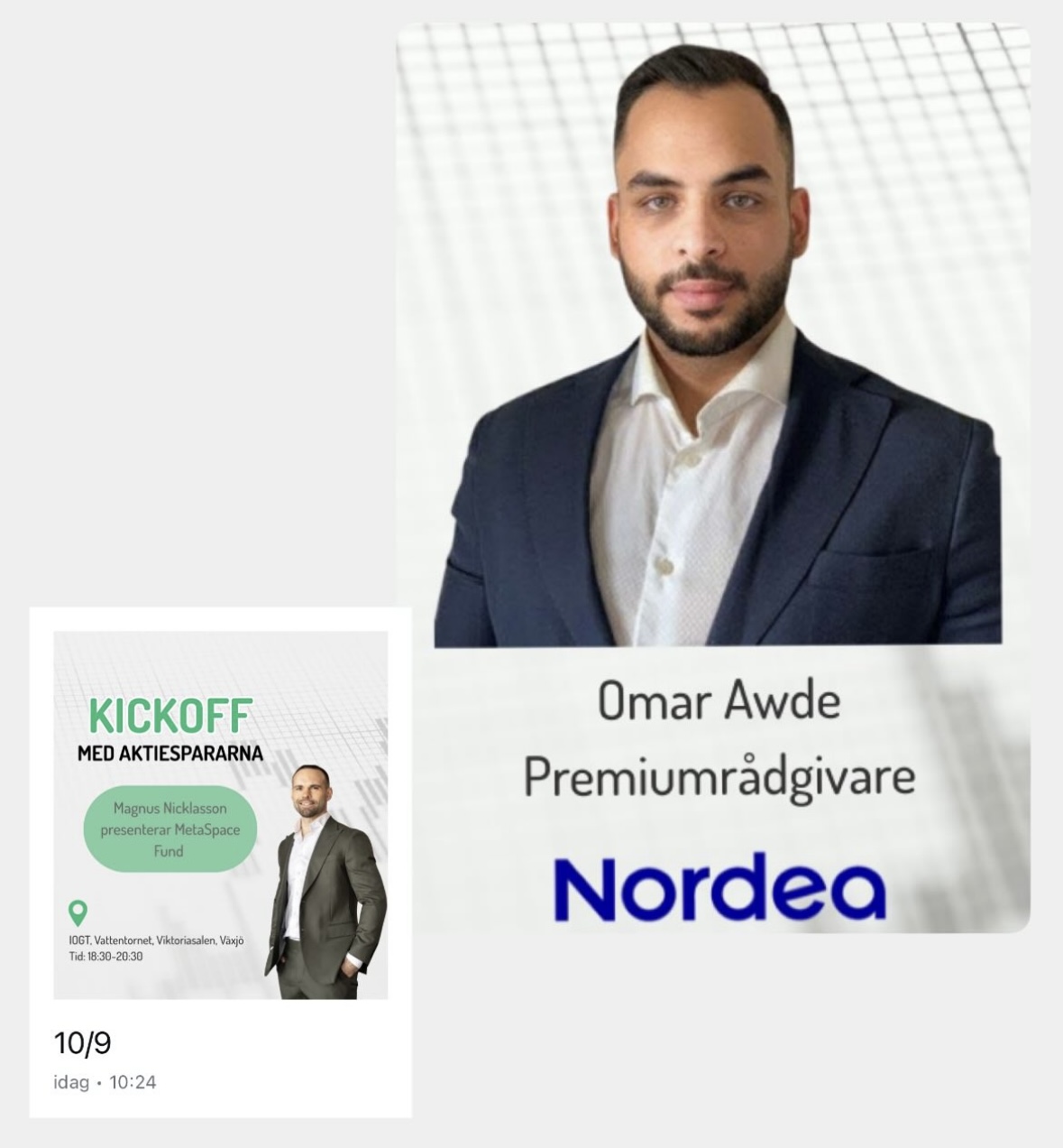 - Omar Awde, premiumrådgivare på Nordea, som delar med sig av insikter kring Nordea Framtidsfond, en fond med fokus på hållbara investeringar samt den nya Empower Europe Fund, som investerar i europeiska bolag med stark tillväxtpotential.