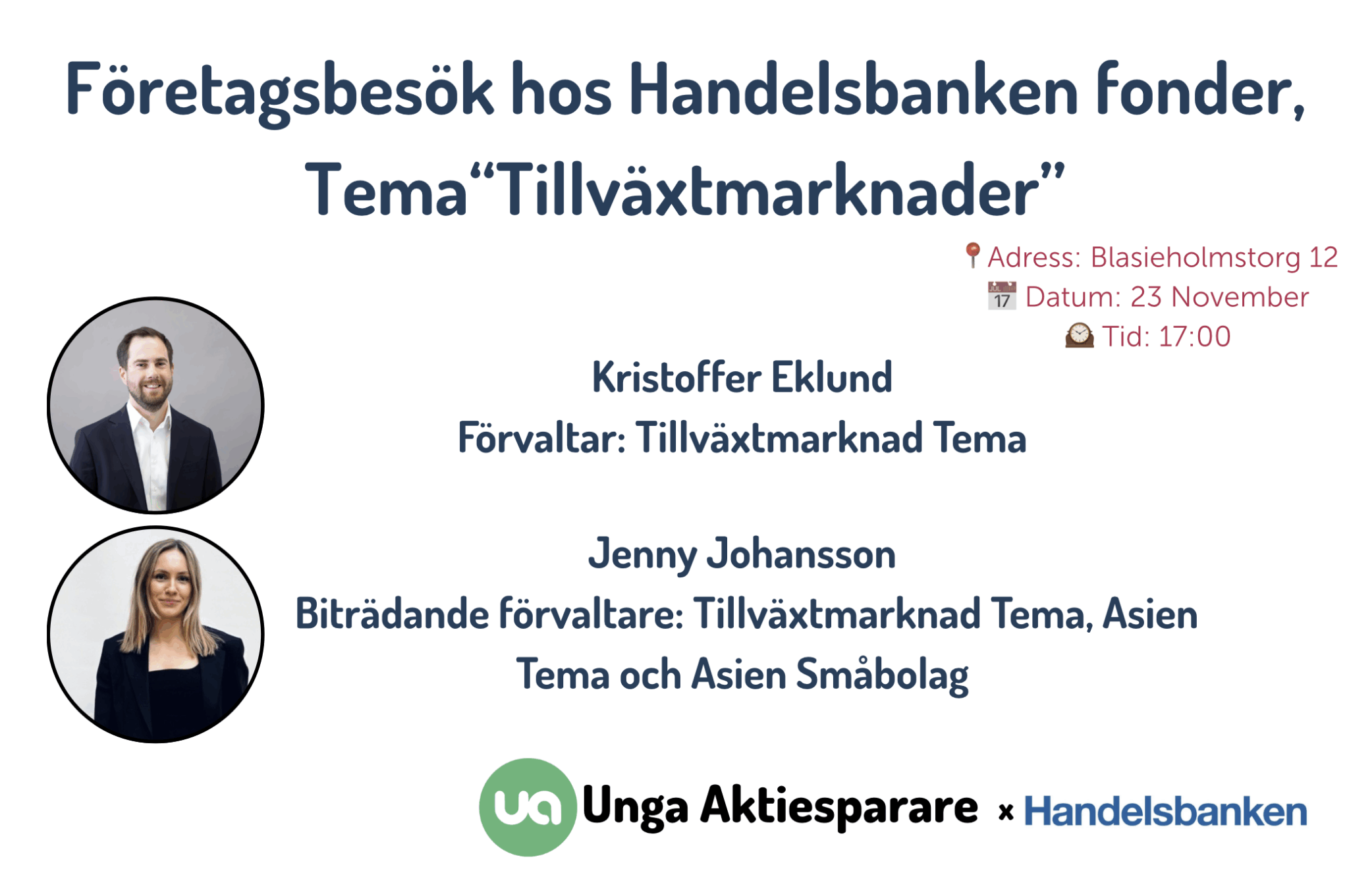 Handelsbanken Tillväxtmarknade Tema förvaltas av Kristoffer Eklund, och Jenny Johansson som biträdande förvaltare förvaltar Tillväxtmarknad Tema, Asien Tema och Asien Småbolag. Handelsbanken Tillväxtmarknad Tema är en aktivt förvaltad aktiefond som placerar i bolag i Asien, Latinamerika, Afrika och Östeuropa. Fonden följer en tematisk strategi där investeringar görs i områden som driver strukturella förändringar i ekonomi och samhälle, med målet att skapa långsiktig tillväxt. Det kommer finnas tid för frågor under kvällen, här är ett läge att ställa bra frågor om tillväxtmarknader och hur man ska tänka kring dem.