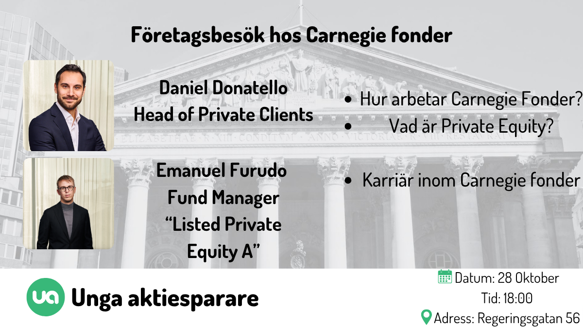 Varmt välkommen till en inspirerande kväll tillsammans med Carnegie Fonder. Daniel kommer att berätta mer om bolaget och dess verksamhet, medan Emanuel delar sina insikter kring fonden Listed Private Equity som han förvaltar.